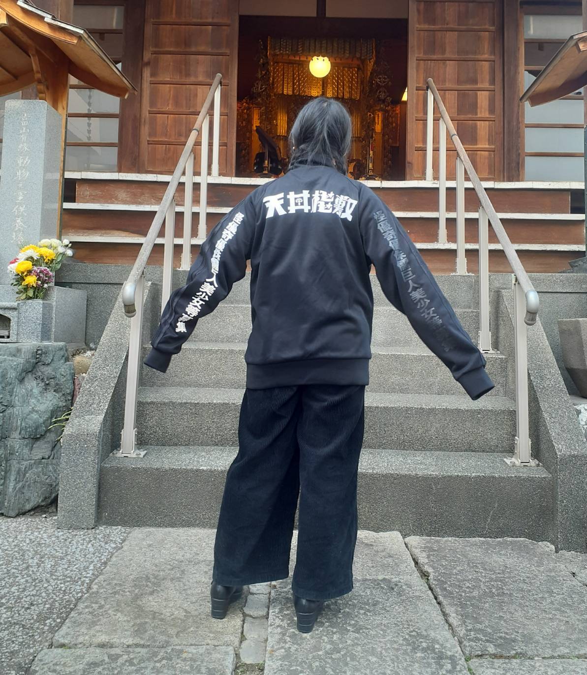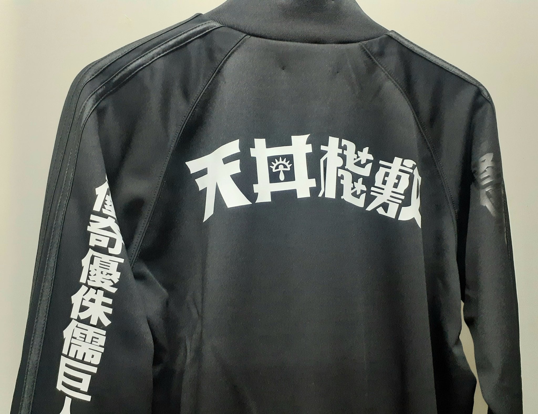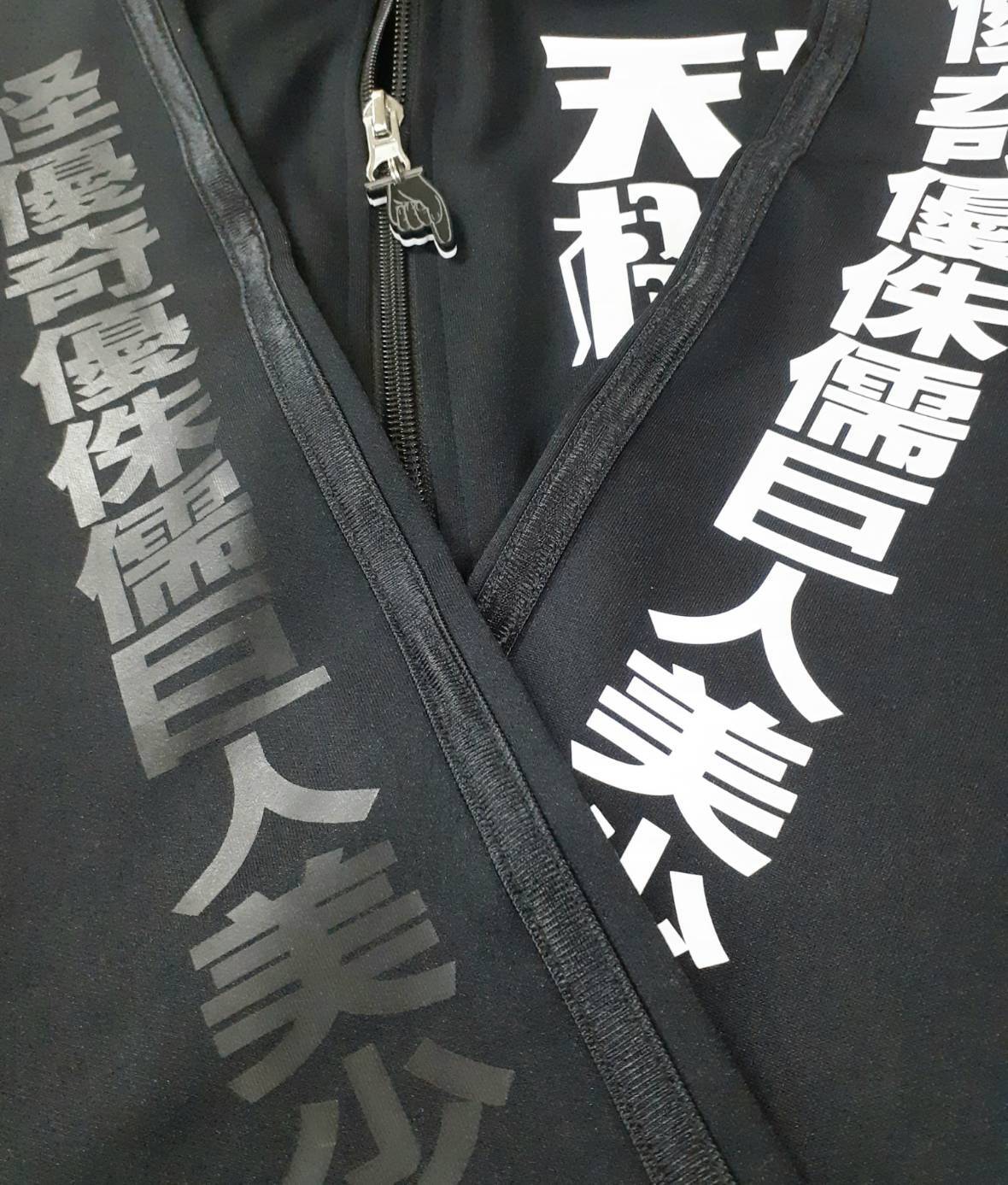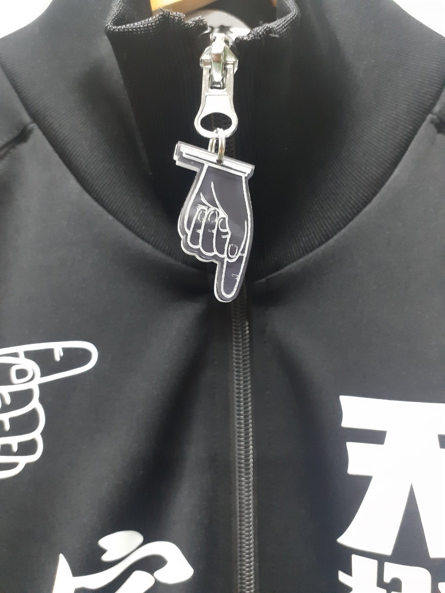 プリントは両胸/両袖/背中、ダブルジップ仕様・指差しチャーム付きです