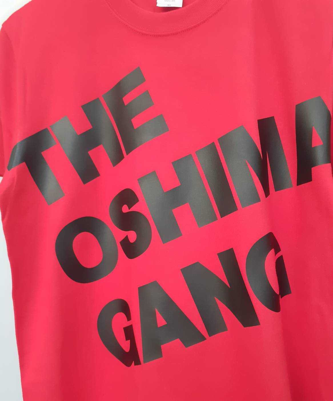 力強いフォントでプリントされた「THE OSHIMA GANG」の文字、斜めに配置されたインパクトの大きいTシャツです