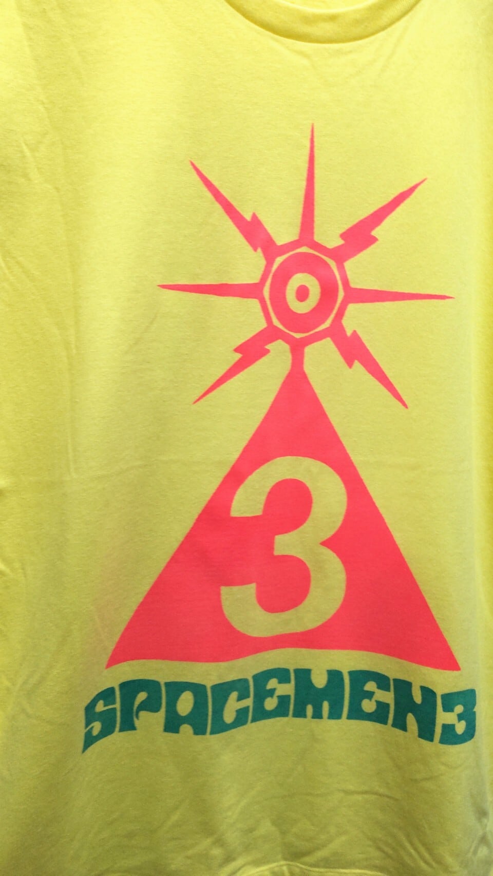 黄色いボディに蛍光色のSPACEMEN3ロゴ、往年のスペースデザインTシャツです