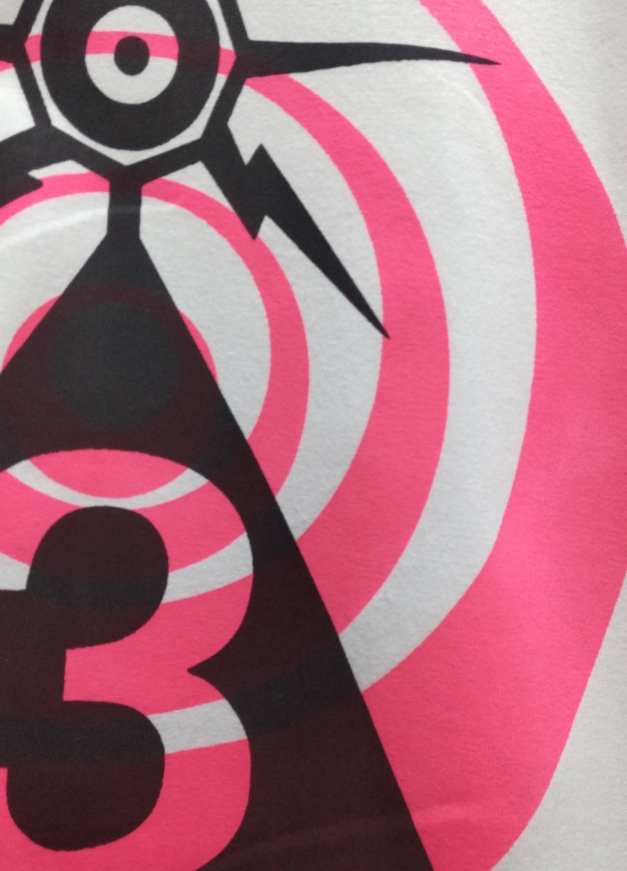ロゴと図形を重ねてプリントしたデザイン、以前の放射プリントよりもスペースメン度がアップ、プリントサイズもかなり大きくなってインパクトのある1枚になりました